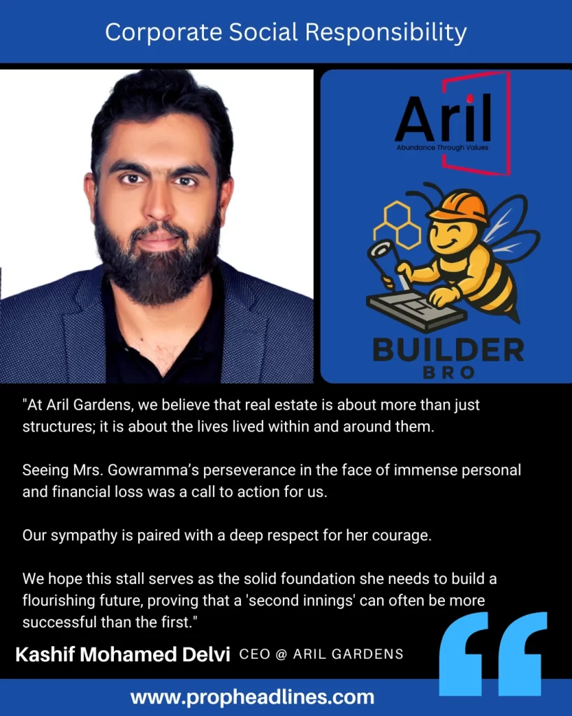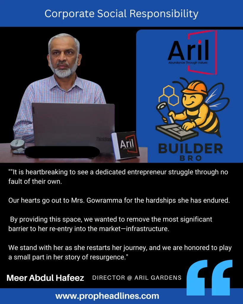“At Aril Gardens, we believe that real estate is about more than just structures; it is about the lives lived within and around them. Seeing Mrs. Gowramma’s perseverance in the face of immense personal and financial loss was a call to action for us. Our sympathy is paired with a deep respect for her courage. We hope this stall serves as the solid foundation she needs to build a flourishing future, proving that a ‘second innings’ can often be more successful than the first.”