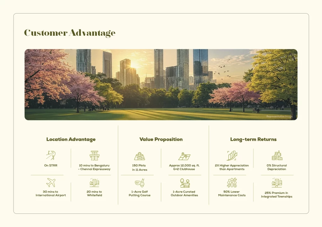 The project’s primary allure lies in its exceptional connectivity. Positioned near the Satellite Town Ring Road (STRR) and the upcoming Bengaluru-Chennai Expressway, the development ensures seamless transit to Kempegowda International Airport and the Whitefield IT hub. Industry experts note that Hoskote has witnessed a significant 40% appreciation in property values over the last decade, fueled by the proximity of the KIADB Industrial Hub and the arrival of global manufacturing giants.